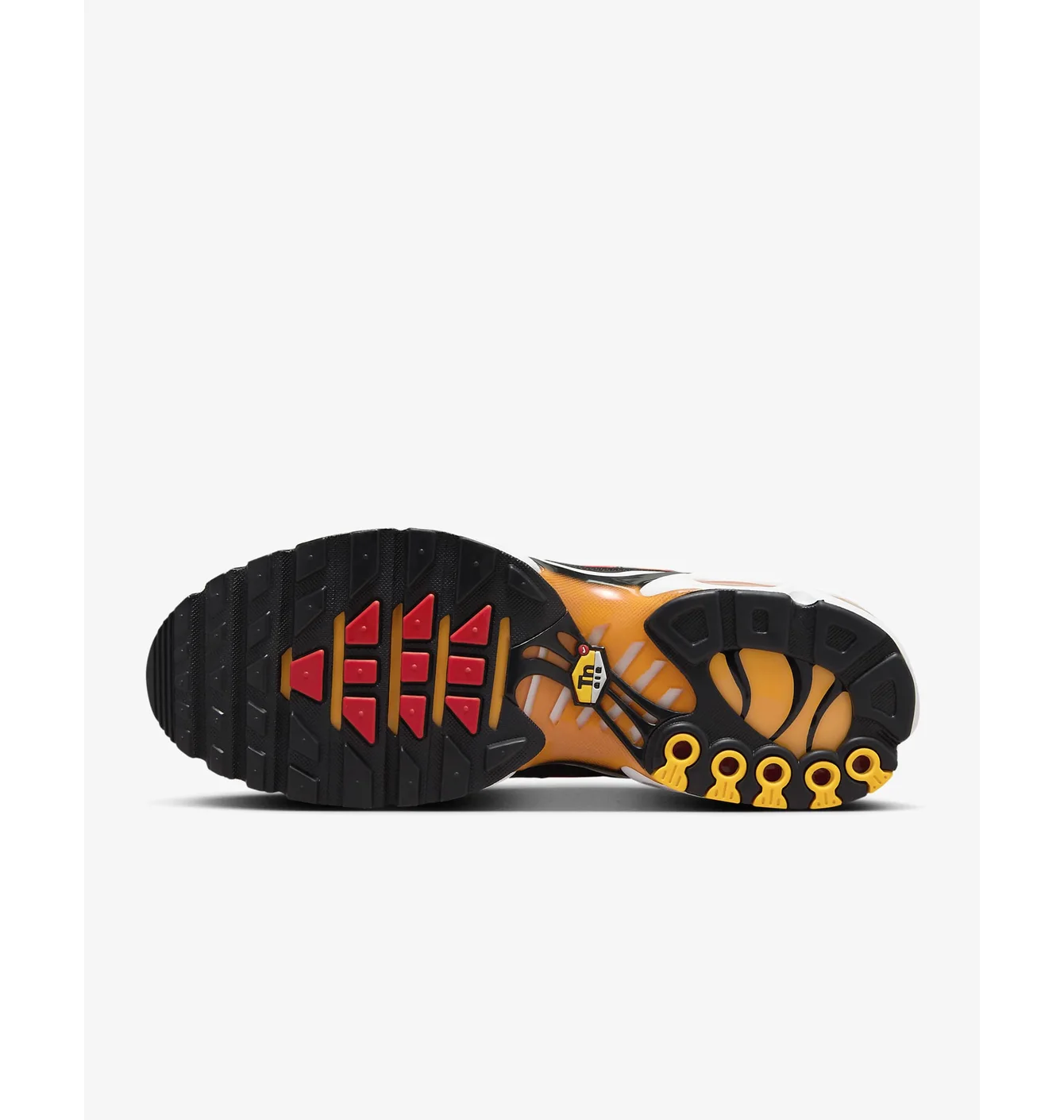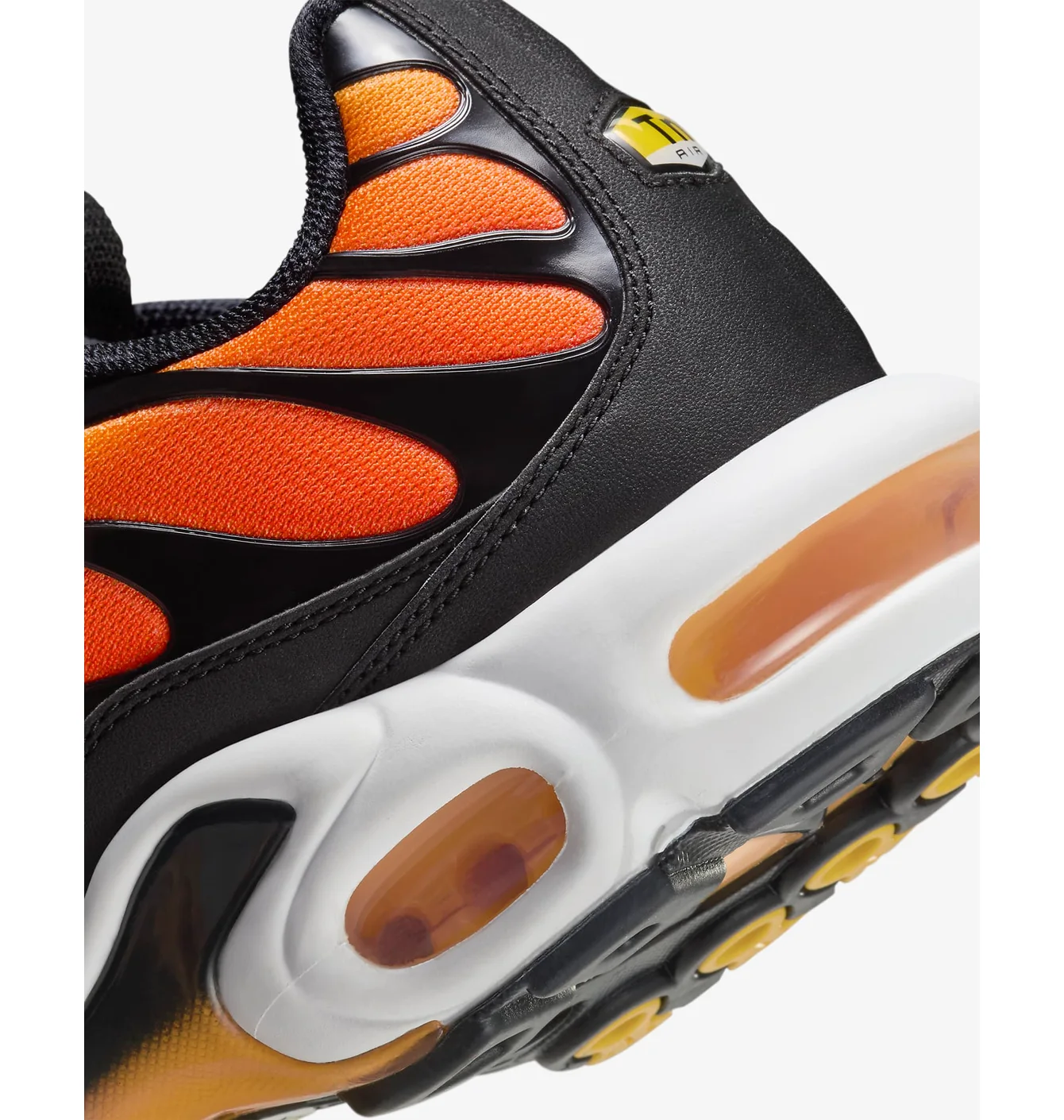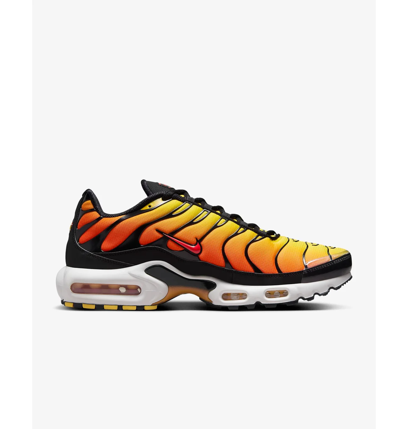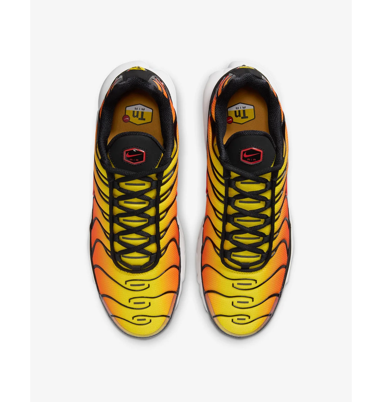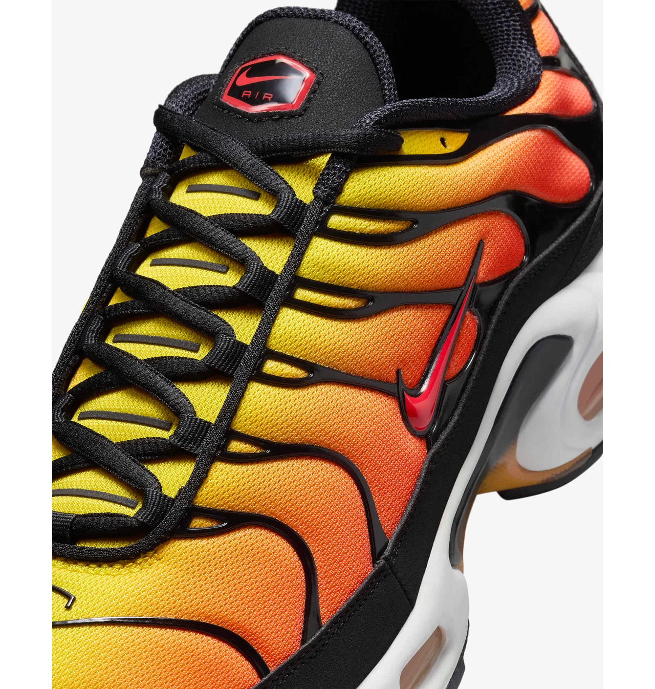Дизайн: силует Nike Air Max Plus з характерними хвилеподібними TPU-лініями на верху, що характерно для цієї легендарної моделі, у варіації Sunset із відтінками оранжевого/жовтого та контрастними елементами дизайну.