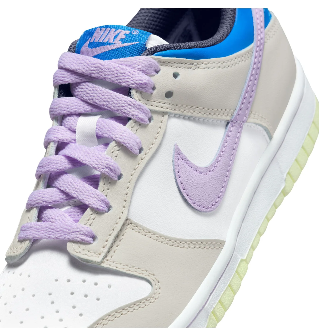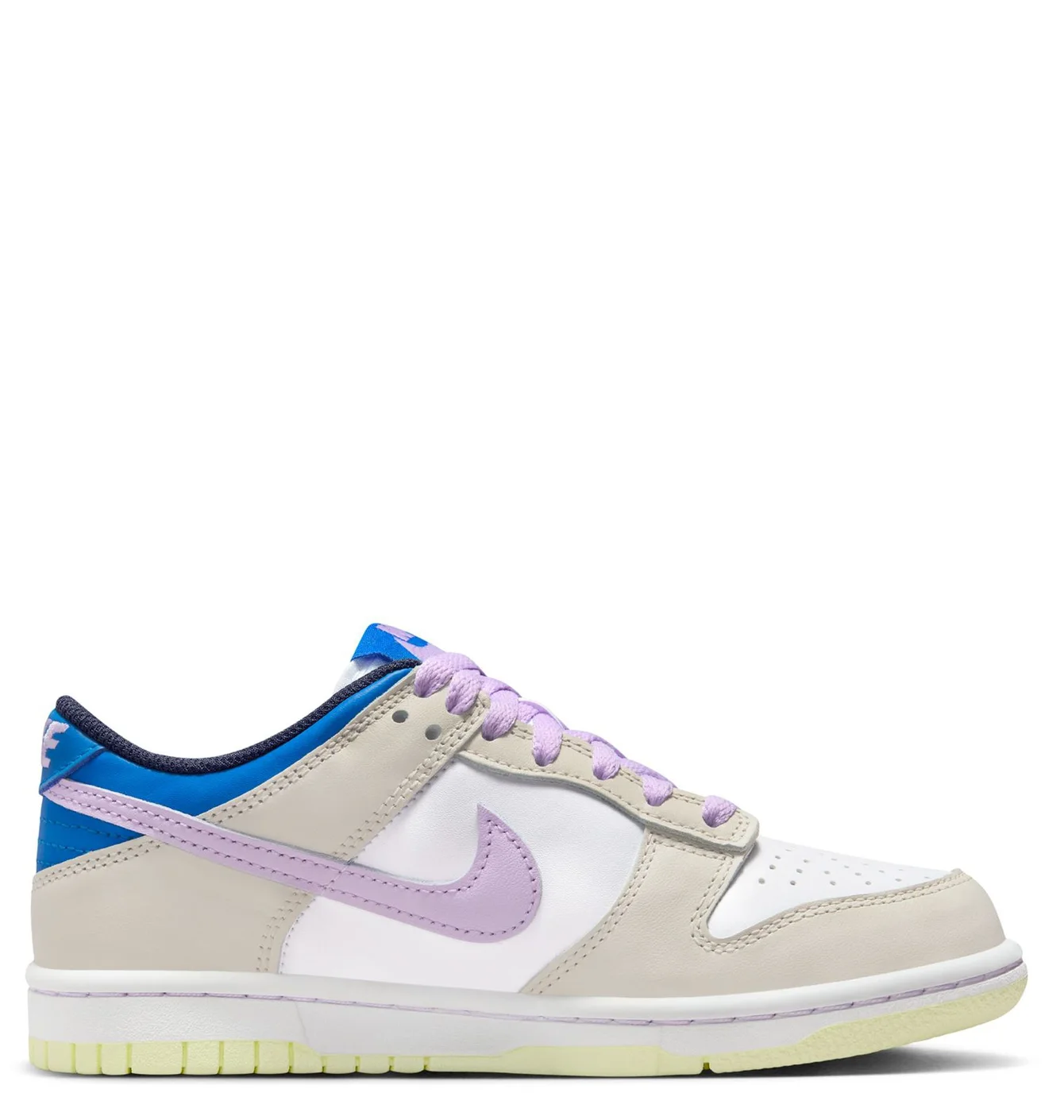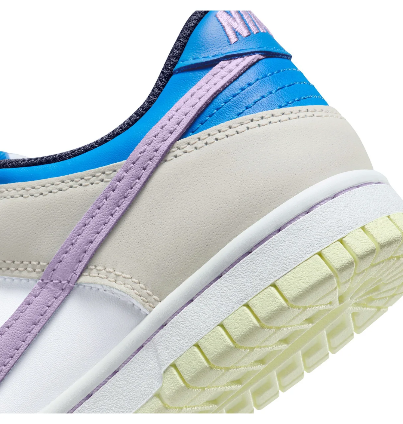 Ця версія Nike Dunk Low має свіжий мікс кольорів, який поєднує нейтральні бежеві тони з яскравими синіми й рожевими акцентами, що додає парі cotton-candy / pastel vibe і робить її універсальною для streetwear-луків і повсякденного гардеробу.